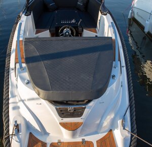 Inoltre, è possibile utilizzare facilmente il cuscino prendisole di prua e fissare uno sci d'acqua a un'impugnatura/maniglia dedicata. Offre anche la possibilità di riporre tutte le cose necessarie in 6 ampi scomparti. Anche i dettagli sono stati studiati per garantire il mantenimento di basse velocità e facilità di manovra grazie all'innovativa linea di carena.